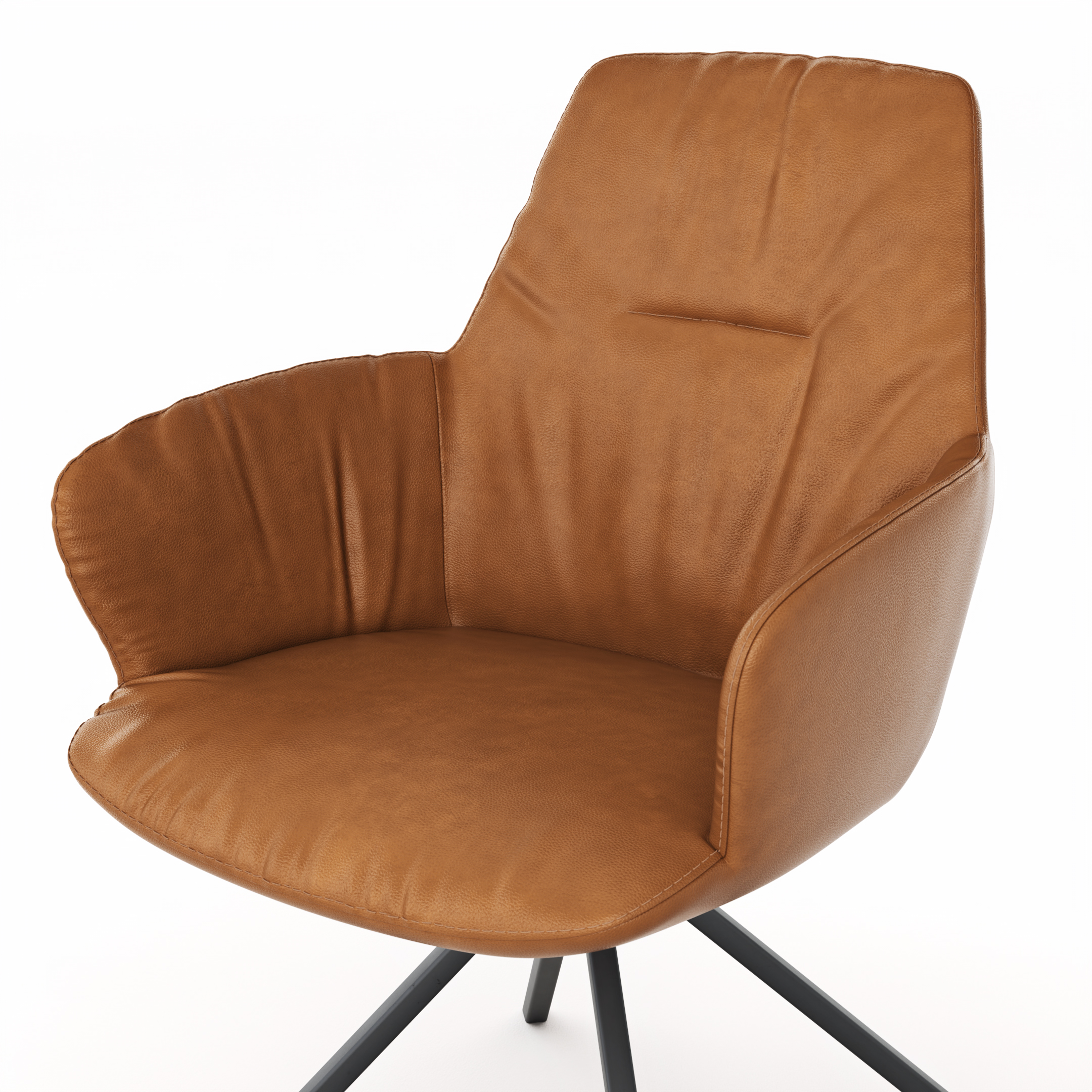 Die Quernaht im Rücken ist ein besonderes Detail und rundet das Gesamtbild harmonisch ab. Hier ist ein solides Vierkantrohr Metallgestell in Stativform mit der bezogenen Sitzschale kombiniert.