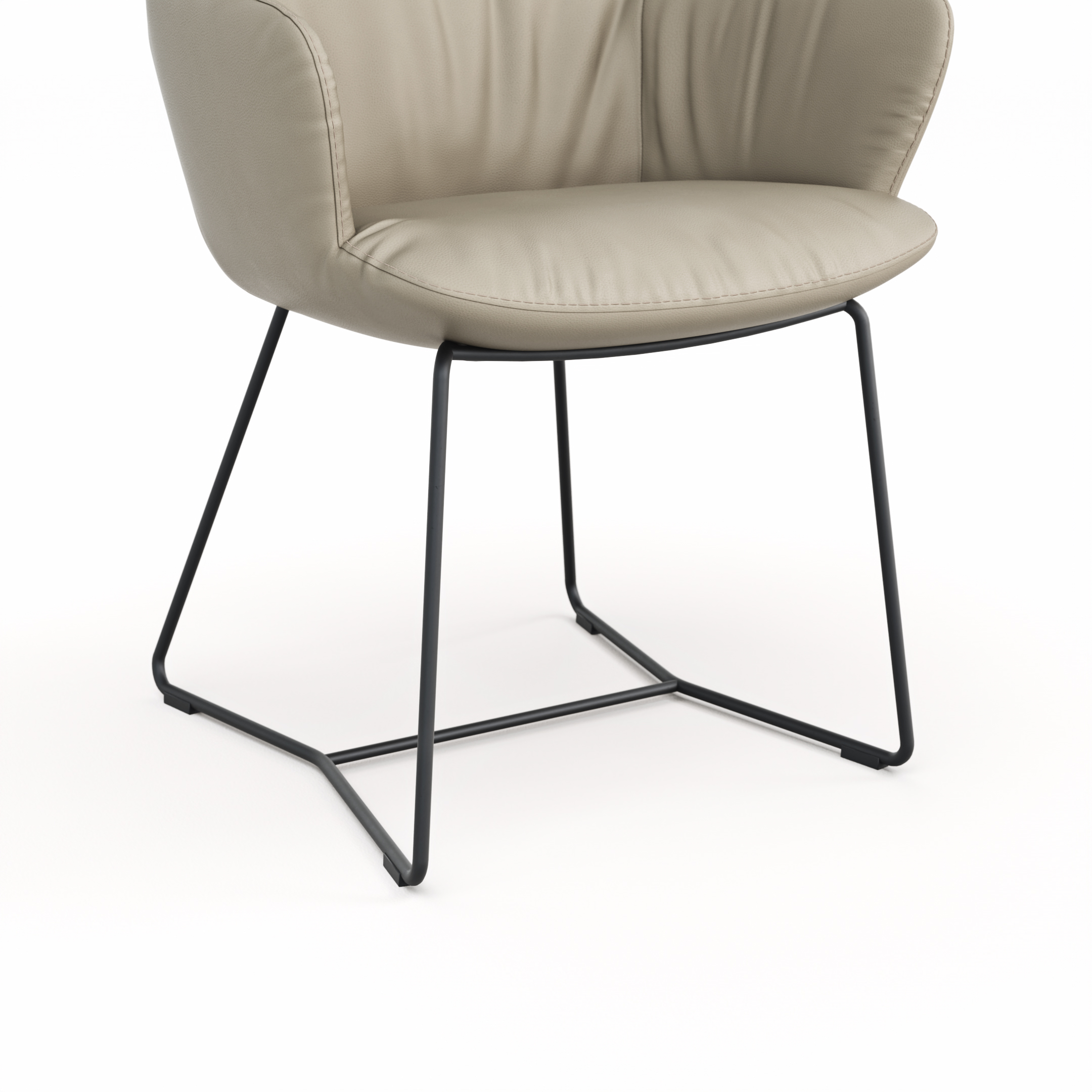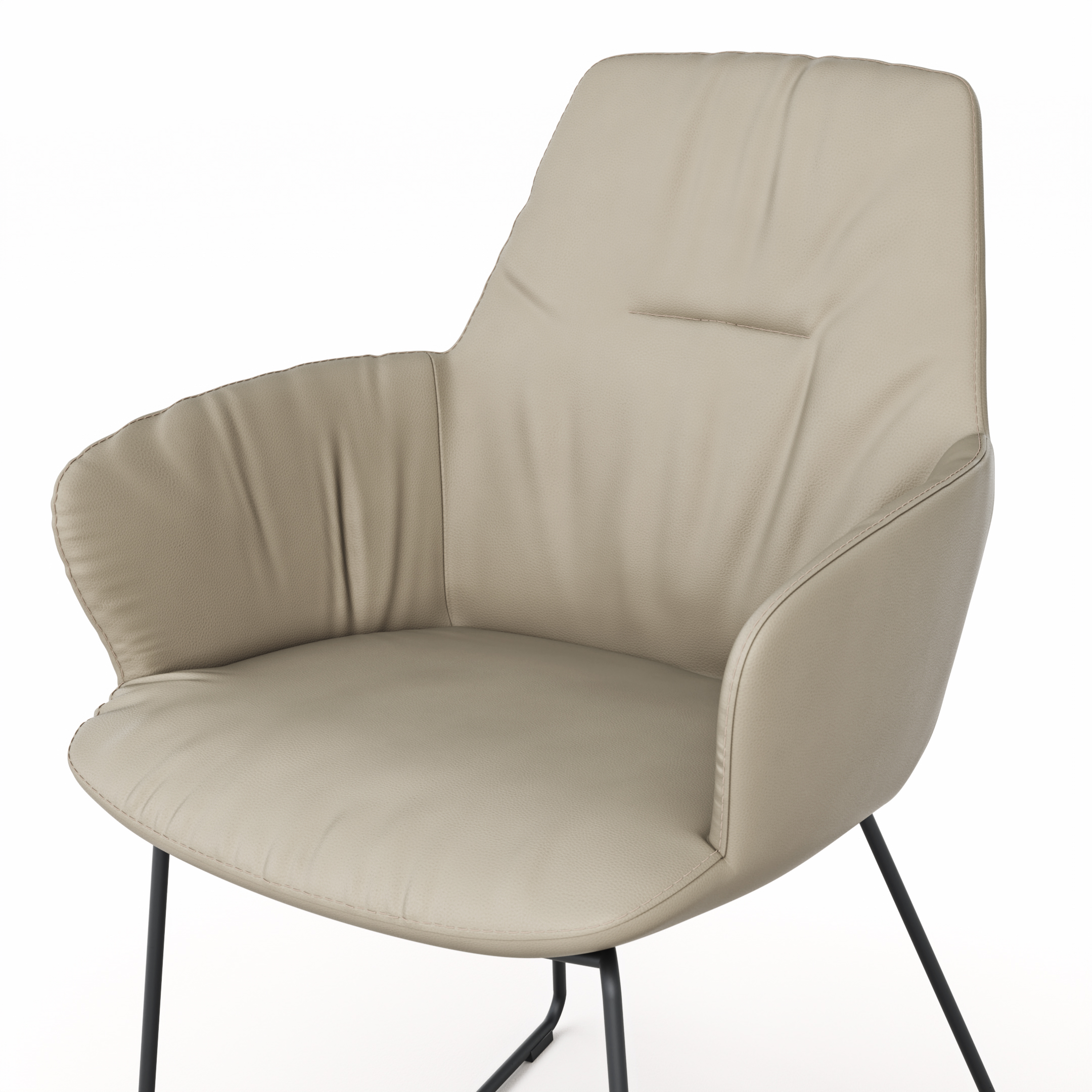 Die Leichtigkeit des filigrane Kufengestell steht im vollen Kontrast zu der komfortablen und ergonomischen Sitzschale. In handwerklicher Verarbeitung entsteht eine PU Schaum Formschale mit einem Metallrahmen für hohe Beanspruchungen. Sitz und Rücken sind soft und leger gepolstert. Faltenbildung ist bei dieser Polsterung durch das Design gewollt. Als Bezug wird ein weiches und anschmiegsames Leder oder stapazierfähige Stoffe verwendet.