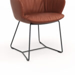 Die Leichtigkeit des filigrane Kufengestell steht im vollen Kontrast zu der komfortablen und ergonomischen Sitzschale. In handwerklicher Verarbeitung entsteht eine PU Schaum Formschale mit einem Metallrahmen für hohe Beanspruchungen. Sitz und Rücken sind soft und leger gepolstert. Faltenbildung ist bei dieser Polsterung durch das Design gewollt. Als Bezug wird ein weiches und anschmiegsames Leder oder stapazierfähige Stoffe verwendet.