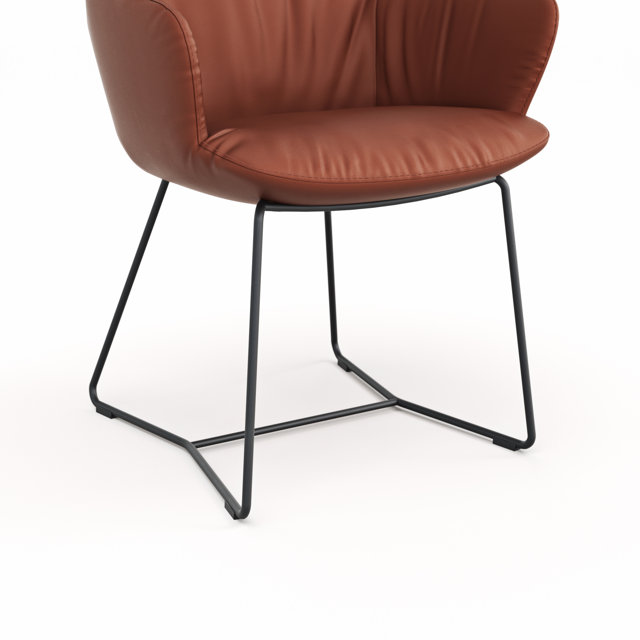 Die Leichtigkeit des filigrane Kufengestell steht im vollen Kontrast zu der komfortablen und ergonomischen Sitzschale. In handwerklicher Verarbeitung entsteht eine PU Schaum Formschale mit einem Metallrahmen für hohe Beanspruchungen. Sitz und Rücken sind soft und leger gepolstert. Faltenbildung ist bei dieser Polsterung durch das Design gewollt. Als Bezug wird ein weiches und anschmiegsames Leder oder stapazierfähige Stoffe verwendet.