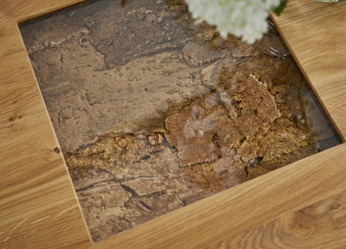 Platte mit Einsatz Korkakzent hinter Klarglas