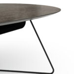 Entdecke den Couchtisch Fano von Contur in modernem Design. Mit einer dreieckigen Platte aus HPL-Laminat in stilvollem Graubraun bietet er eine zeitgemäße Ergänzung für Ihr Wohnzimmer. Die ca. 38 cm hohe Konstruktion aus schwarzem Metall in Bügelform verleiht Stabilität und Eleganz. Die ca. Maße von 121×75 cm machen ihn vielseitig einsetzbar, während das minimalistische Design harmonisch in jede Einrichtung passt. Besonders praktisch ist das unter dem Tisch angebrachte Ablagefach. Ein Highlight für alle, die Wert auf Qualität und einzigartiges Design legen.