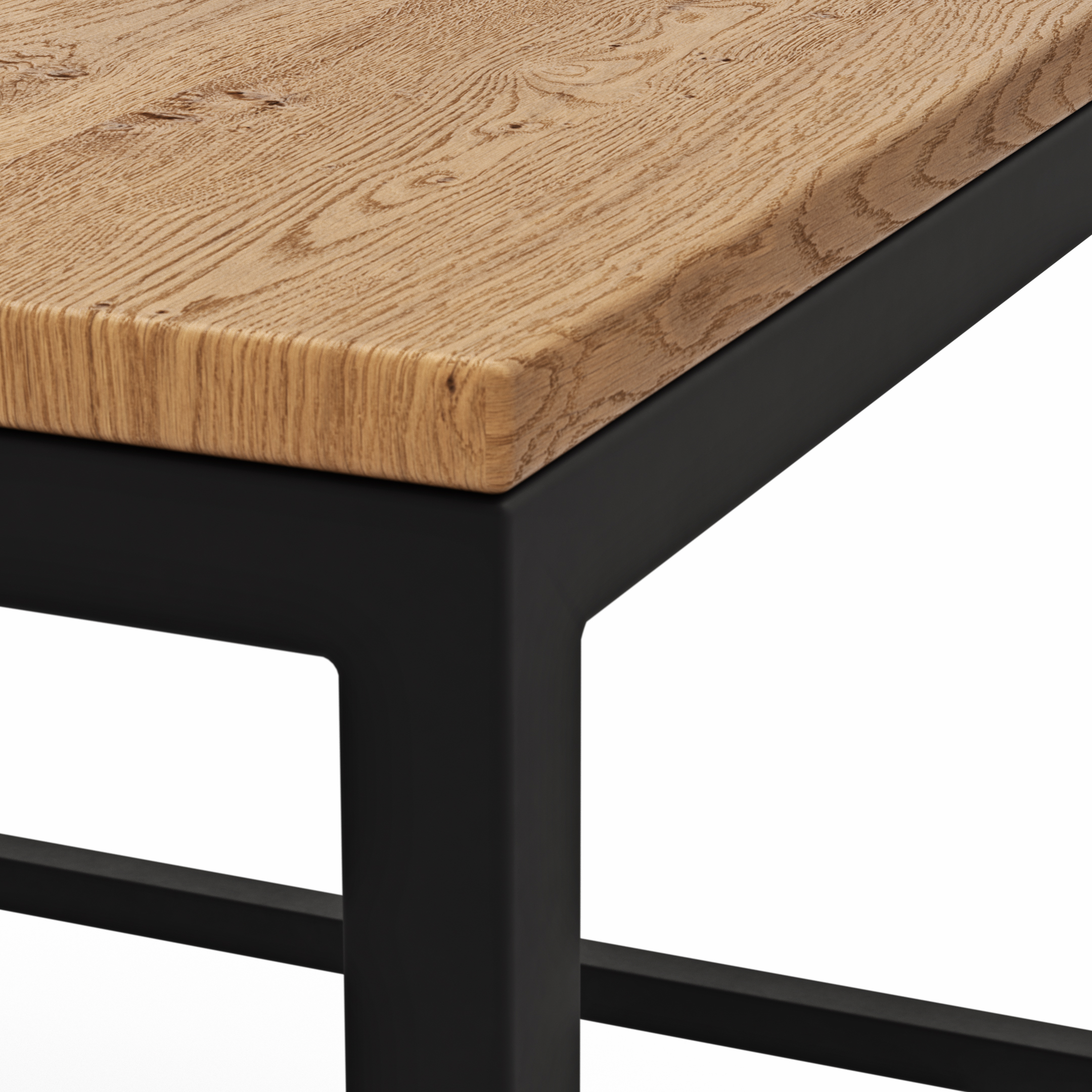 Alle Typen haben ein filigranes Gestell aus Schwarz lackiertem Stahl. Die Platten könnt Ihre individuell kombinieren. Sie sind verfügbar in Massiver Eiche, Buche oder mit Schwarzer Keramik in Marmoroptik.