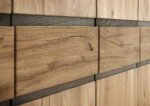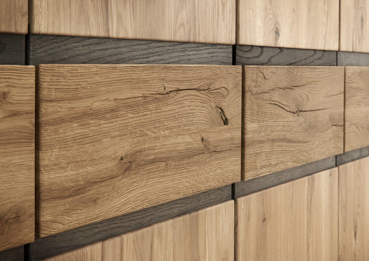 Ein Traum aus Wildeiche: Das Massivholz wurde hervorragend ausgewählt, was dem Schrank ein wunderbares Erscheinungsbild verleiht. Die Wildeiche in der Bauchbinde ist mit natürlichen Wuchsrissen versehen, was einen weiteren Akzent setzt. Eben ein echter Hingucker!