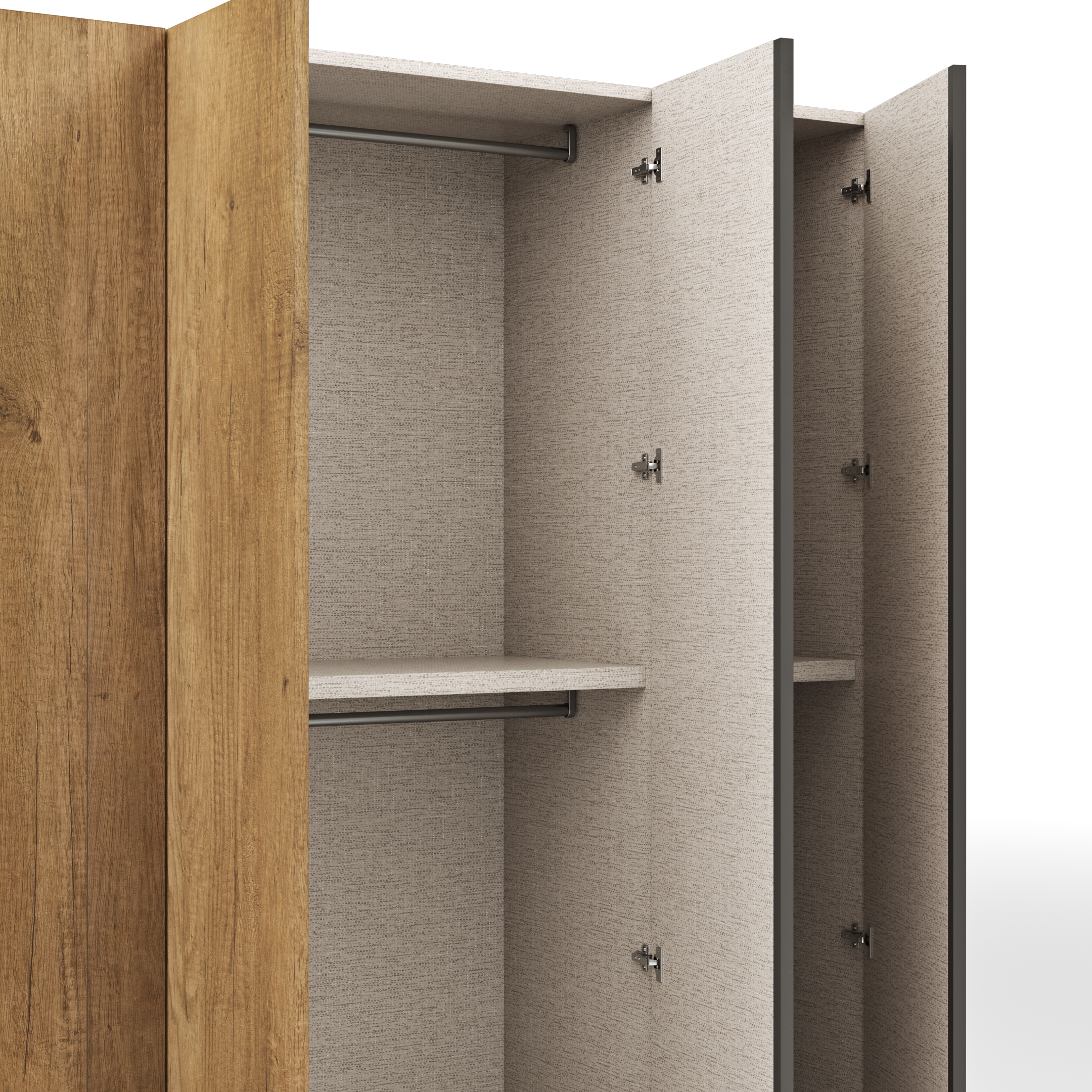 Hochwertige Holzwerkstoffe sind das Grundmaterial für den Schrank Contur Loretto, Das hat den Vorteil von hoher Stabilität bei geringerem Gewicht. Korpus und Fronten in hochwertiger Melaminbeschichtung oder Matt lackiert. Innen in Textiloptik Perlmut. Alle Scharniere sind aus Ganzmetall und mit einem gebremsten Schließmechnismus ausgestattet.
