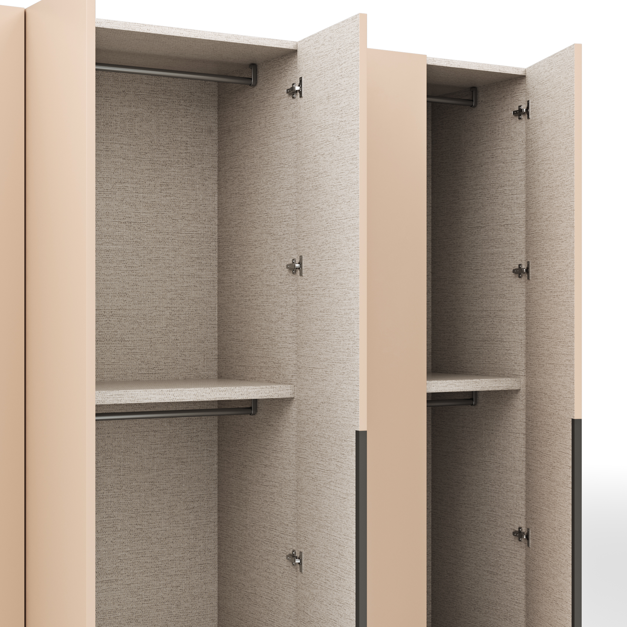 Hochwertige Holzwerkstoffe sind das Grundmaterial für den Schrank Contur Loretto, Das hat den Vorteil von hoher Stabilität bei geringerem Gewicht. Korpus und Fronten in hochwertiger Melaminbeschichtung oder Matt lackiert. Innen in Textiloptik. Alle Scharniere sind aus Ganzmetall und mit einem gebremsten Schließmechnismus ausgestattet.