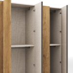 Hochwertige Holzwerkstoffe sind das Grundmaterial für den Schrank Contur Loretto, Das hat den Vorteil von hoher Stabilität bei geringerem Gewicht. Korpus und Fronten in hochwertiger Melaminbeschichtung oder Matt lackiert. Innen in Textiloptik Perlmut. Alle Scharniere sind aus Ganzmetall und mit einem gebremsten Schließmechnismus ausgestattet.