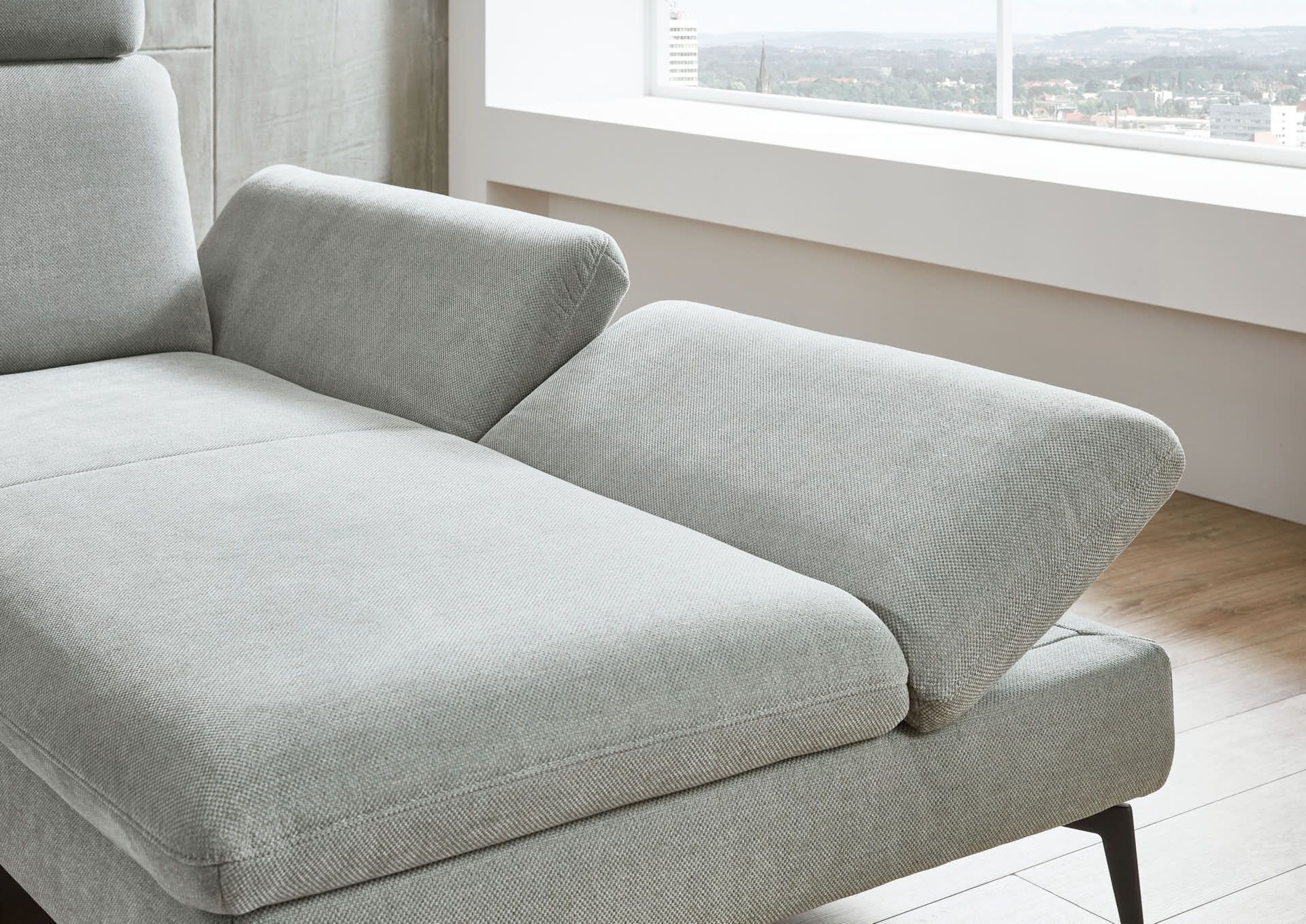 Ecksofa – 3-Sitzer mit Longchair rechts, Armlehne verstellbar, Stoff, Silbergrau