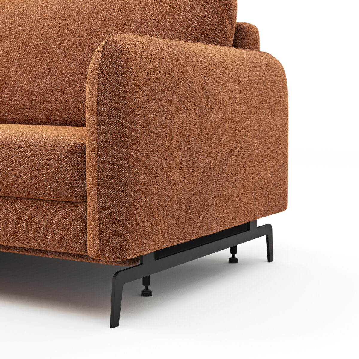 Das Ecksofa Enna von Contur beeindruckt mit seiner modernen Ästhetik und großartigen Funktionalität. Der Longchair auf der linken Seite und der 1,75-Sitzer bieten großzügigen Komfort. Die motorische Relaxfunktion sorgt für ultimativen Entspannungskomfort. Der Sitz besteht aus hochwertigem Kaltschaum und Stahlwellenfedern, während die Rückenlehne mit Silikonschaum gefüllt ist. Die ca. 45 cm Sitzhöhe ist ideal für bequemes Sitzen. Die schwarz lackierten Kufenbeine aus Metall verleihen dem Sofa einen stabilen Stand und ein elegantes Erscheinungsbild. In einem warmen Terracotta-Stoff verleiht es jedem Raum eine einladende Atmosphäre. Belastbarkeit ca. 120 kg.