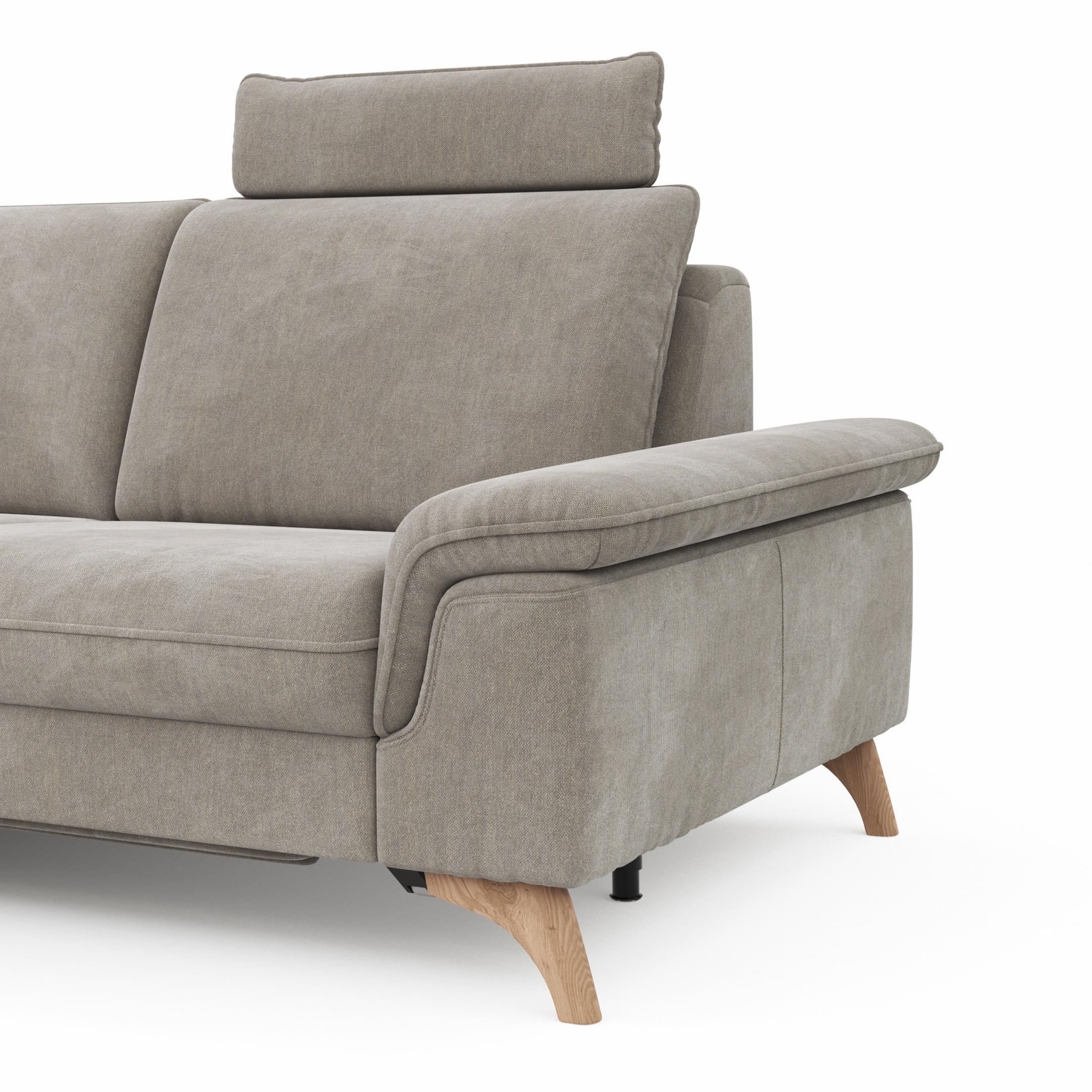 Ecksofa Tulsa KS – 1,5-Sitzer mit Anstellhocker aufklappbar links, Spitzecke und 2,5-Sitzer rechts, inkl. Kopfstütze, AL verstellbar und Schlaffunktion, Stoff, Graubeige