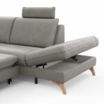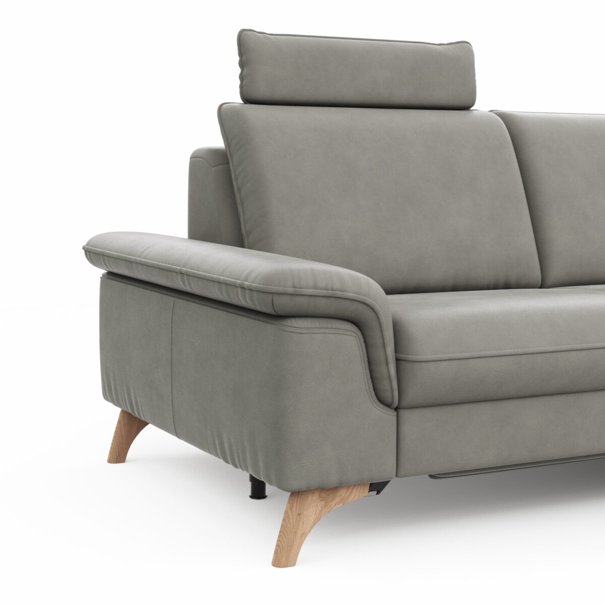 Ecksofa Tulsa KS – 2,5-Sitzer, Spitzecke und 1,5-Sitzer mit Anstellhocker aufklappbar rechts, inkl. Kopfstütze, AL verstellbar und Schlaffunktion, Leder, Graubeige
