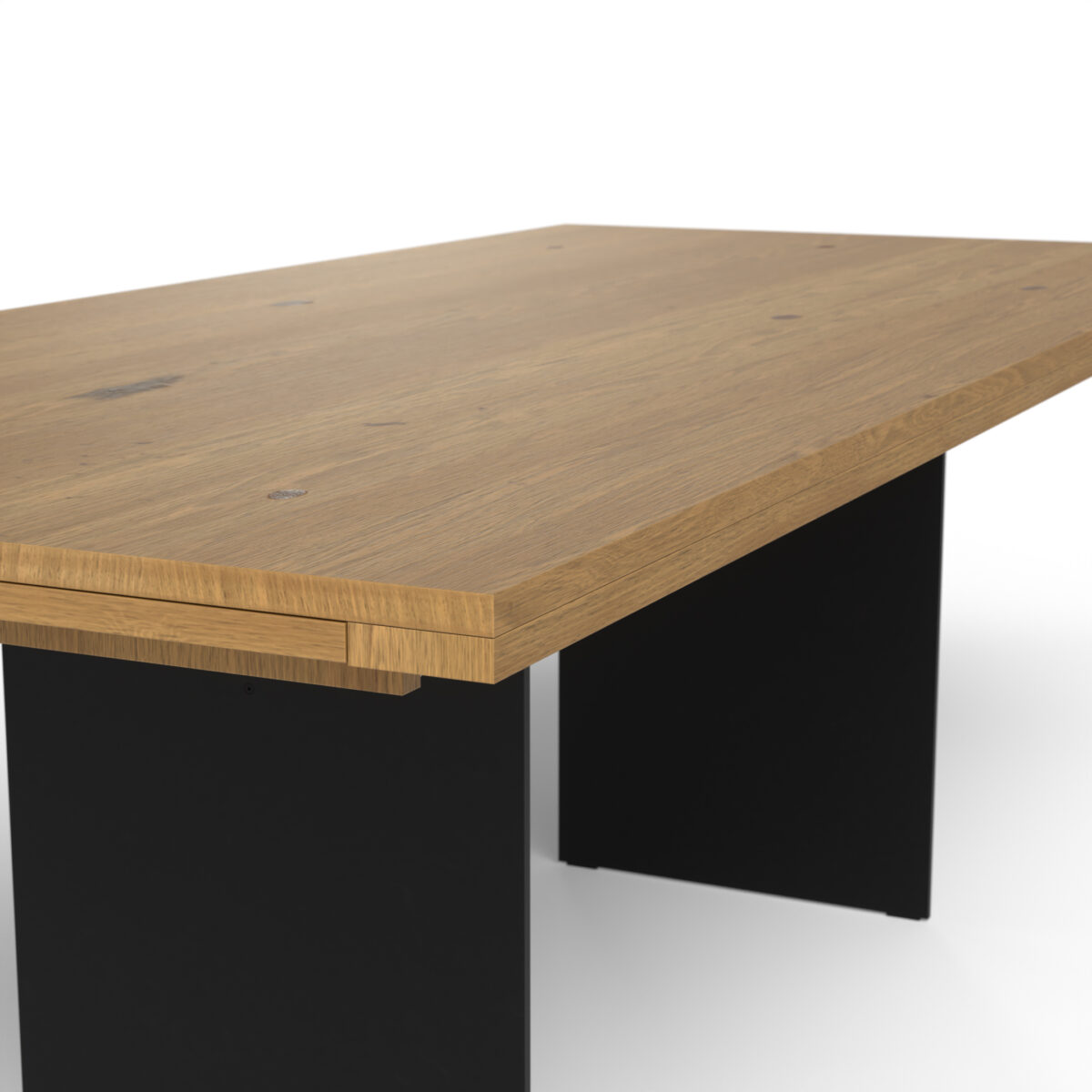 Esstisch 3110 – LB ca. 220×100 cm, ausziehbar, Asteiche massiv, Geölt, Wange Rohstahl, Schwarz