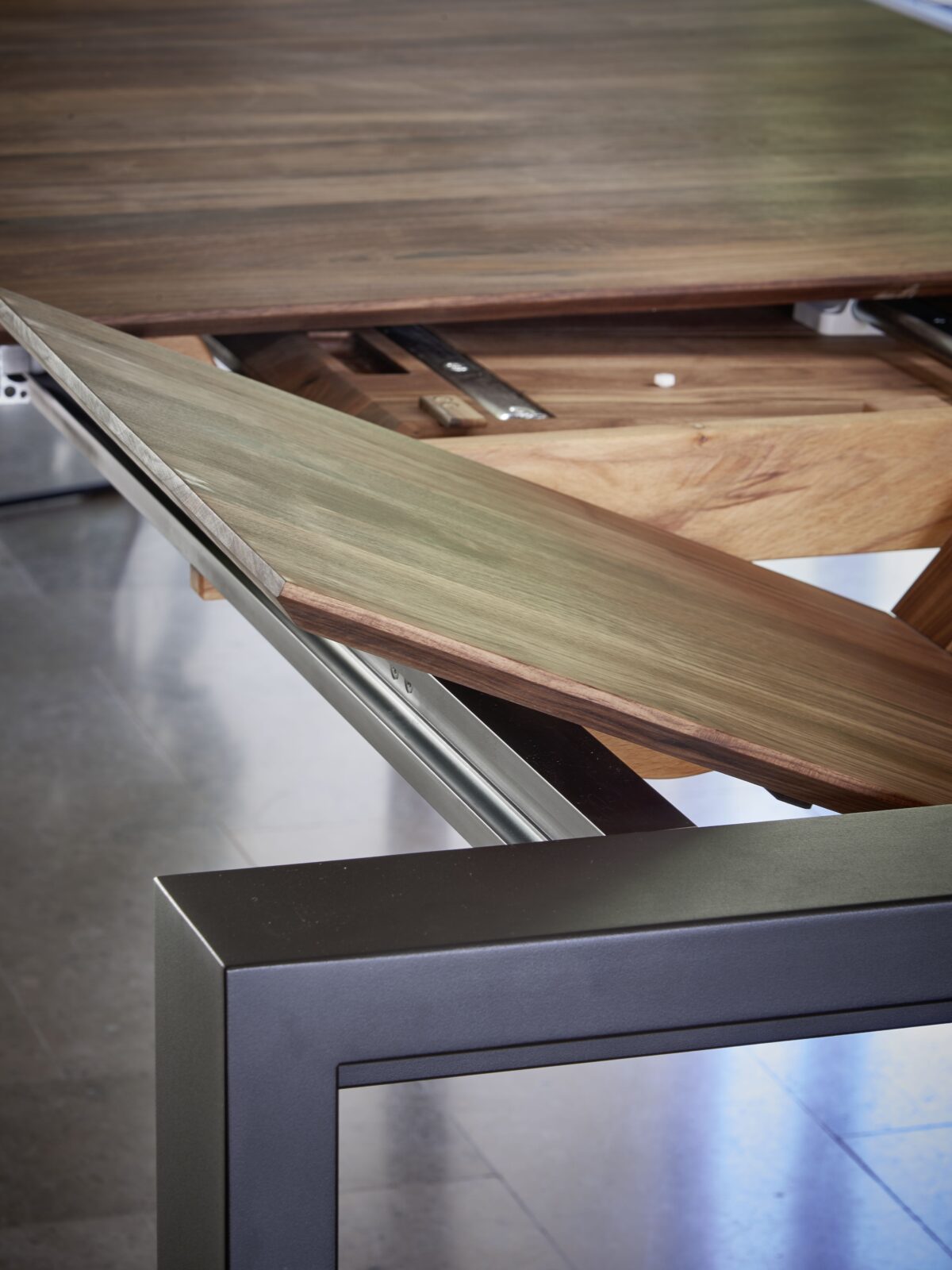 Mit dem leichtgängigem Gestellauszug lässt den Tisch in 2 verschiedenen Größen verlängern. Je nach Bedarf.