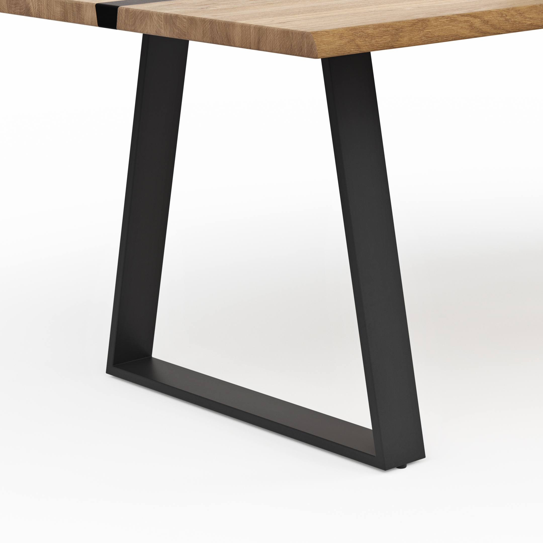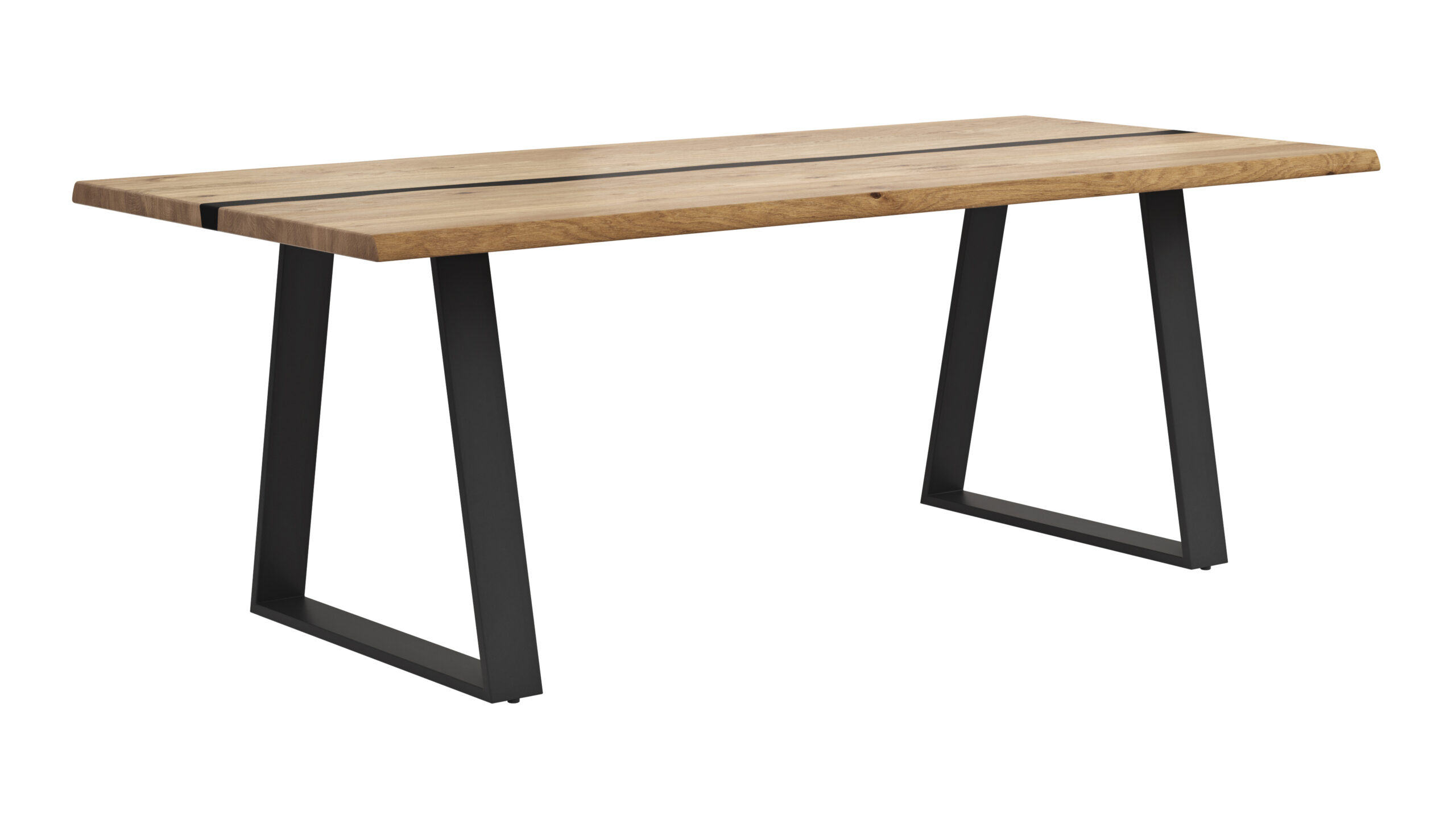 Der Esstisch Kima von Natura Home ist ideal für gesellige Runden. Mit einer Länge von ca. 220 cm und einer Breite von ca. 100 cm bietet er Platz für bis zu 8 Personen. Die Platte aus massiver Wildeiche ist ca. 4 cm dick und verfügt über eine Baumkante. Sie ist geölt, um die natürliche Maserung des Holzes hervorzuheben. Das Trapezgestell aus Metall in Schwarz bildet einen modernen Kontrast zur natürlichen Tischplatte. Mit seiner Höhe von ca. 76 cm passt der Tisch perfekt zu gängigen Esszimmerstühlen.
