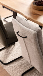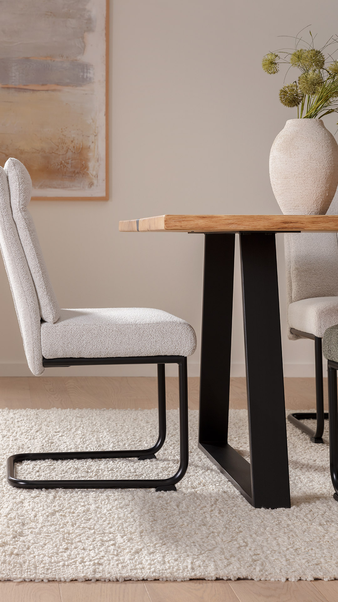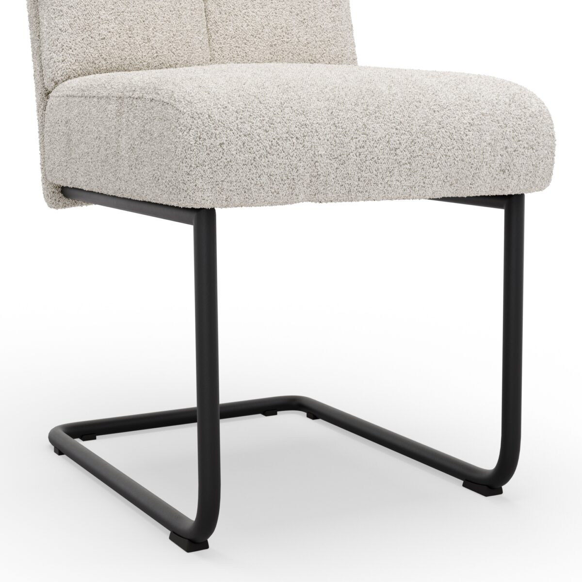 Der Freischwinger Ravina von Natura Home ist ein echter Hingucker. Mit einer Sitzhöhe von ca. 49 cm und einer Belastbarkeit von ca. 142 kg bietet er optimalen Komfort. Der Stuhl ist mit einem cremefarbenen Stoff bezogen, der perfekt mit den schwarzen Beinen aus Eisen harmoniert. Die Freischwinger-Form verleiht dem Stuhl eine besondere Eleganz und Stabilität. Zusätzlich ist der Stuhl mit einem Griff ausgestattet, der das Bewegen erleichtert. Mit dem Freischwinger Ravina bringst du Stil und Komfort in dein Zuhause.