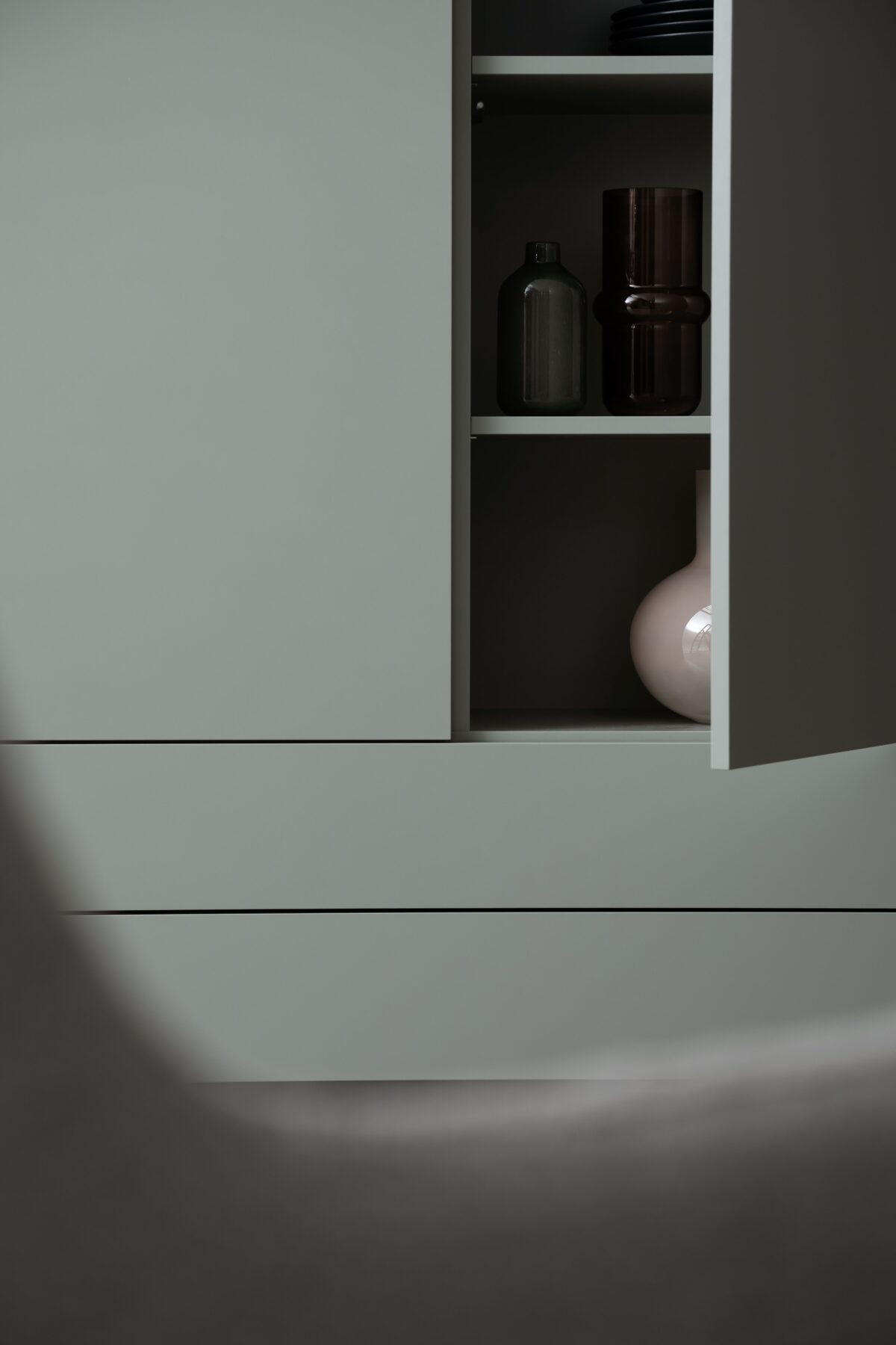 Erlebe das stilvolle Highboard 3900 von Contur in matt lackiertem Salbei. Mit ca. 200 cm Höhe und ca. 45 cm Tiefe bietet es großzügigen Stauraum. Zwei Türen und zwei Schubladen, beide mit sanfter Dämpfung, garantieren leises Schließen. Das grifflose Push-to-Open-Design verleiht dem Möbelstück ein modernes und elegantes Aussehen. Dieses Highboard verbindet Funktionalität und Ästhetik auf höchstem Niveau.