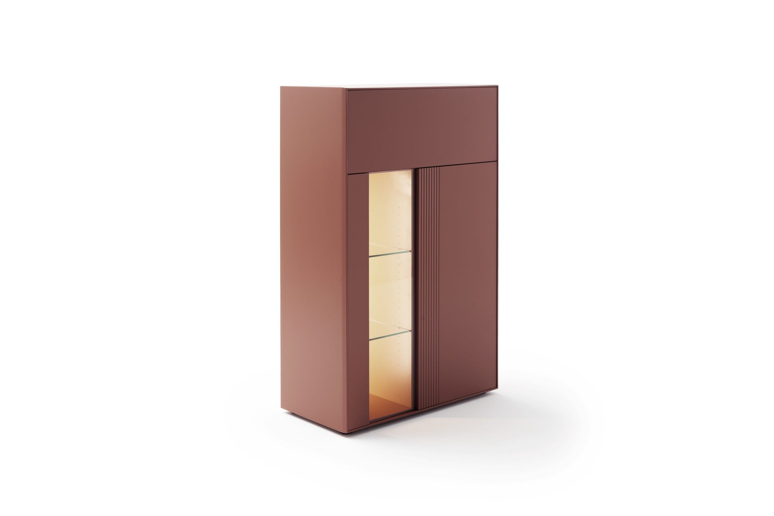 Entdecke das stilvolle Highboard Colore von Contur einrichten in der eleganten Farbe Samtbeere. Mit ca. 90x144x45 cm bietet es großzügigen Stauraum hinter 2 Türen und 1 Klappe. Die integrierte Beleuchtung setzt deine Lieblingsstücke gekonnt in Szene. Dank der Tür- und Klappendämpfung schließt alles sanft und leise. Ideal für moderne Wohnräume!