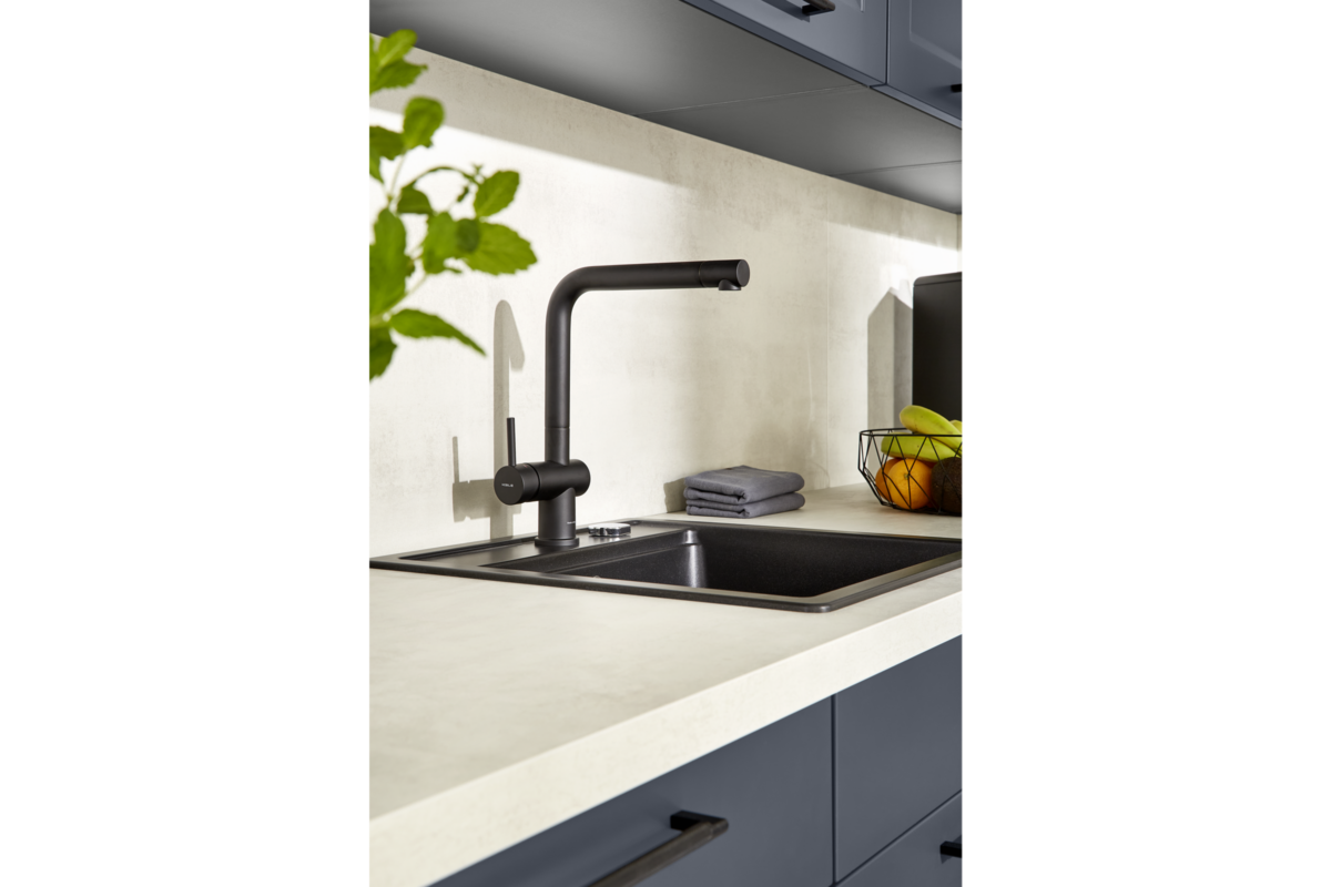 Erlebe die Ästhetik und Funktionalität der L-Küche 37.160 in Fjord Blau. Ihr unverwechselbarer Fjord Blau-Farbton bringt eine frische Brise in deine Küche und setzt ein stilvolles Statement. Die L-Küche 37.160 ist nicht nur ein optisches Highlight, sondern auch ein wahres Raumwunder, das dir bei der Organisation deiner Küchenutensilien hilft.