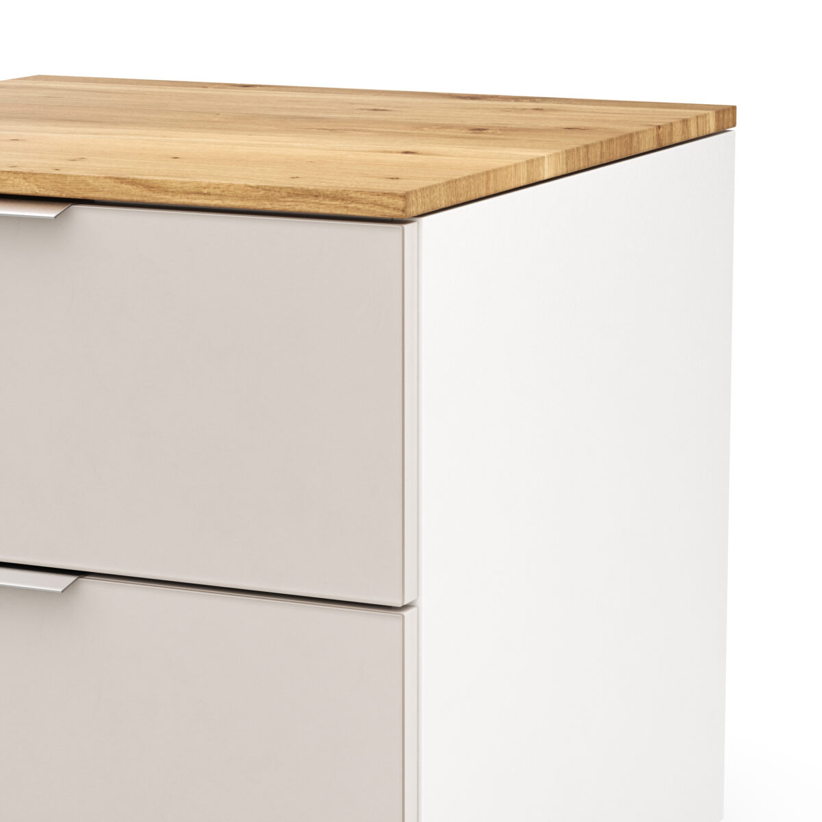 Der Nachttisch Colorado von Natura Home bringt einen Hauch von Farbe in dein Schlafzimmer. Die sanft schimmernde Glasfront in edlem Rosé verleiht ihm eine besondere Leichtigkeit und verbirgt zugleich zwei geräumige Schubladen für praktische Aufbewahrung. Ein harmonischer Kontrast entsteht durch die robuste Abdeckplatte aus hochwertigem Wildeiche-Furnier, die dem Nachttisch eine natürliche Wärme verleiht. Der restliche Korpus in dezentem Weiß hält sich zurück und lenkt den Blick auf die stilvollen Farbakzente.