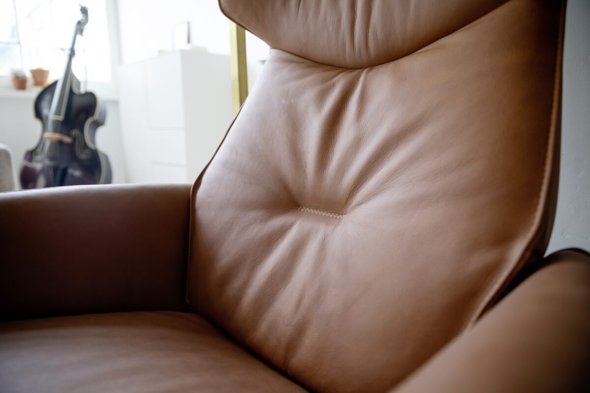 Entdecken Sie den ultimativen Luxus der Entspannung mit unserem Relaxsessel „Raum.Freunde Helge“. Dieser Design-Sessel strahlt schlichte Eleganz mit seinem Lederbezug aus und setzt damit in Ihrem Raum ein stilvolles Statement. Doch die Bequemlichkeit kommt keineswegs zu kurz. Der verstellbare Rücken und das individuell anpassbare Kopfteil ermöglichen eine maßgeschneiderte Sitzposition, die Ihren persönlichen Komfortbedürfnissen gerecht wird.
