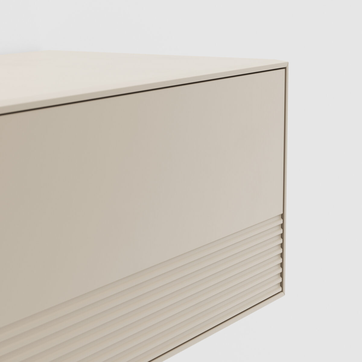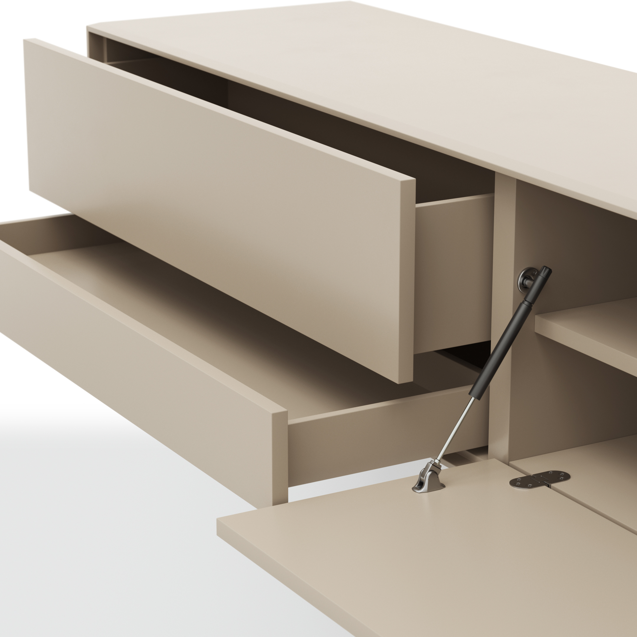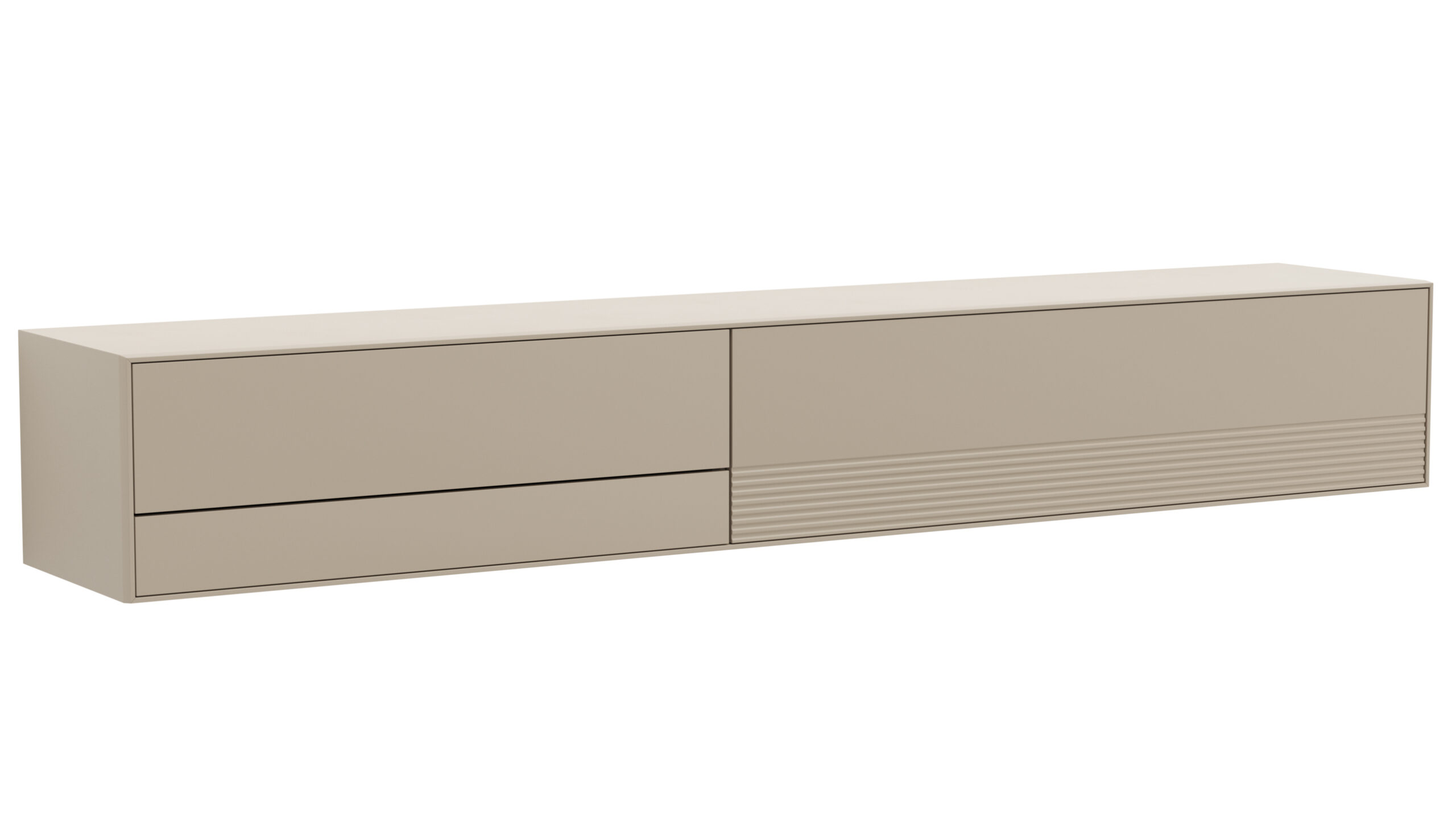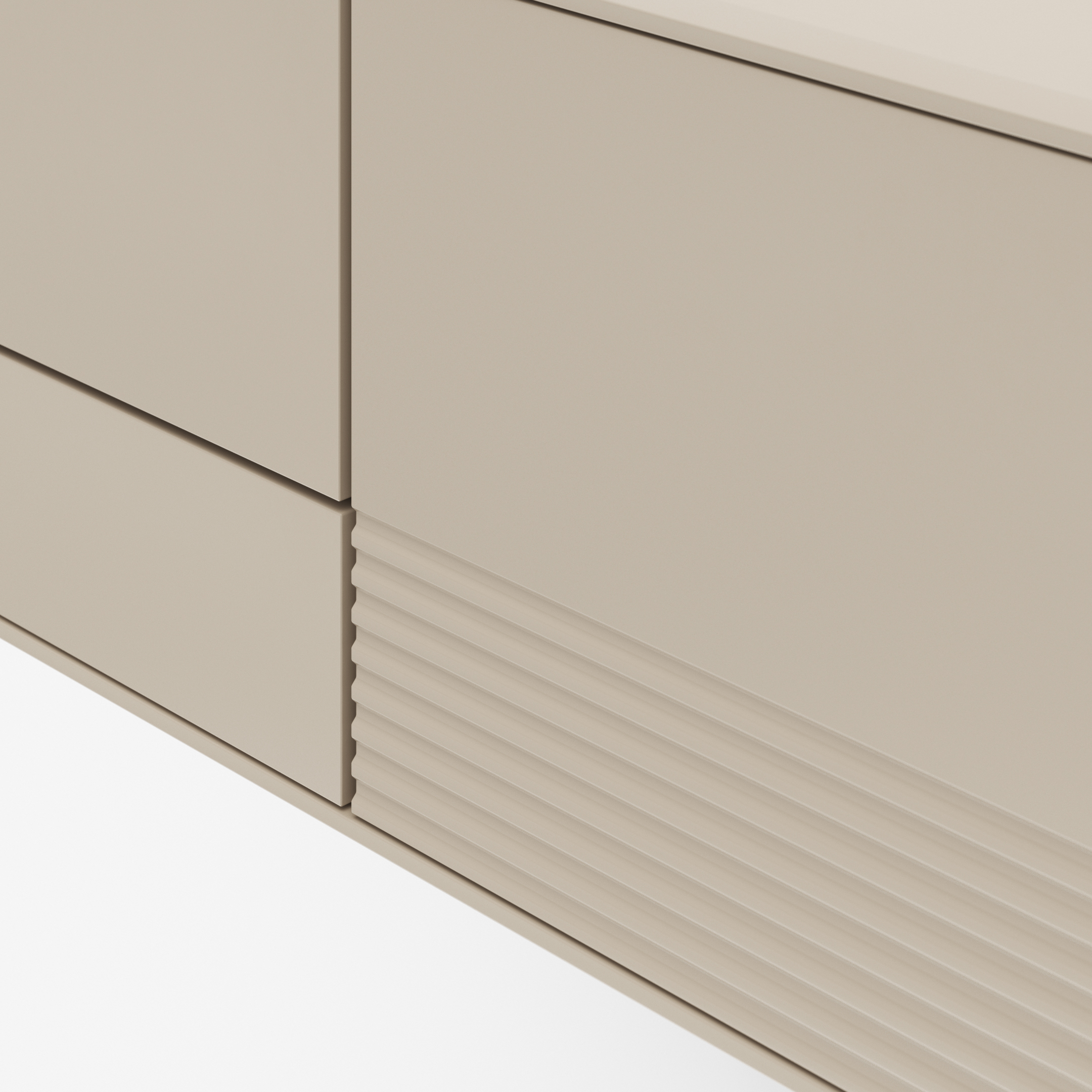 Das Sideboard Colore von Contur einrichten beeindruckt mit seinem minimalistischen Design und der eleganten Lackierung in Kaschmir. Mit ca. 240 cm Breite, ca. 36 cm Höhe und ca. 45 cm Tiefe fügt es sich nahtlos in jeden Raum ein. Die grifflosen Push-to-Open-Fronten sorgen für ein modernes Erscheinungsbild. Eine Klappe mit Dämpfung und zwei Schubladen bieten ausreichend Stauraum. Ideal für ein stilvolles und aufgeräumtes Zuhause.