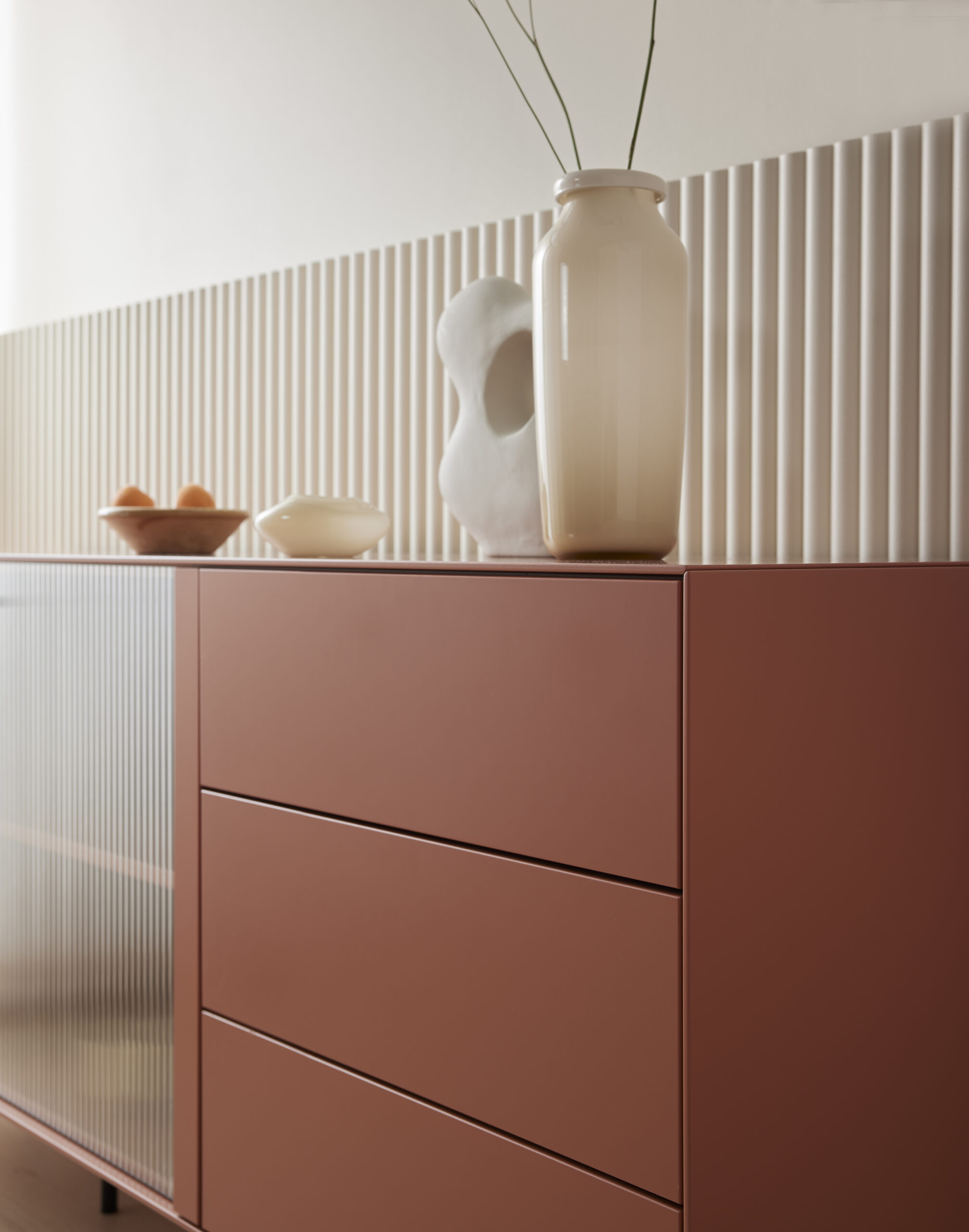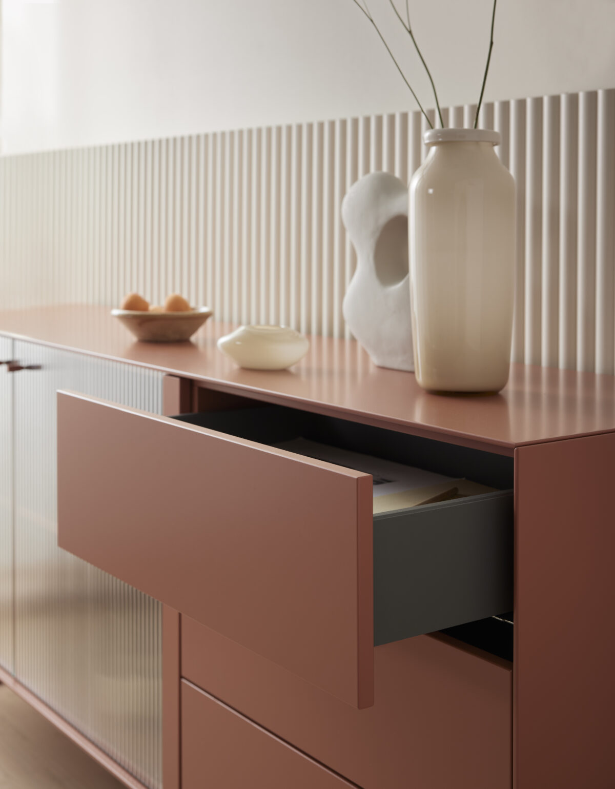 Das „Sideboard Henri – Lack matt, Antred“ ist ein Produkt der Marke Raum.Freunde und besticht durch seine modernen Linien und die matte Lackierung. Mit drei Schubladen und zwei Türen bietet es reichhaltigen Stauraum. Das Sideboard hat eine Höhe von 79 cm und eine Tiefe von 42 cm. Besonders hervorzuheben ist das Rahmengestell, welches aus robustem Metall gefertigt ist. Dies unterstreicht den industriellen Charme dieses Möbelstücks. Als weiteres Highlight ist das Sideboard mit einem grifflosen Push-to-Open-System ausgestattet, was eine einfache Handhabung ermöglicht und das klare, minimalistische Design unterstützt.