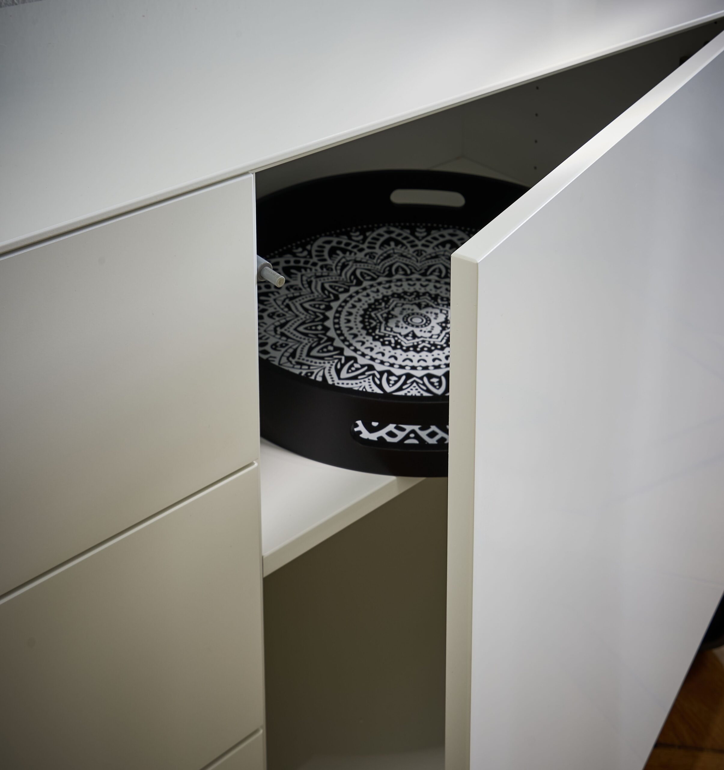 Alle Front Elemente verfügen über einen grifflosen Push to open Beschlag. Durch leichten Druck auf die Front lassen sich Schübe und Türen öffnen.