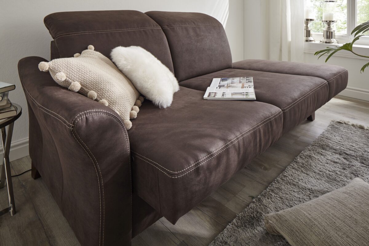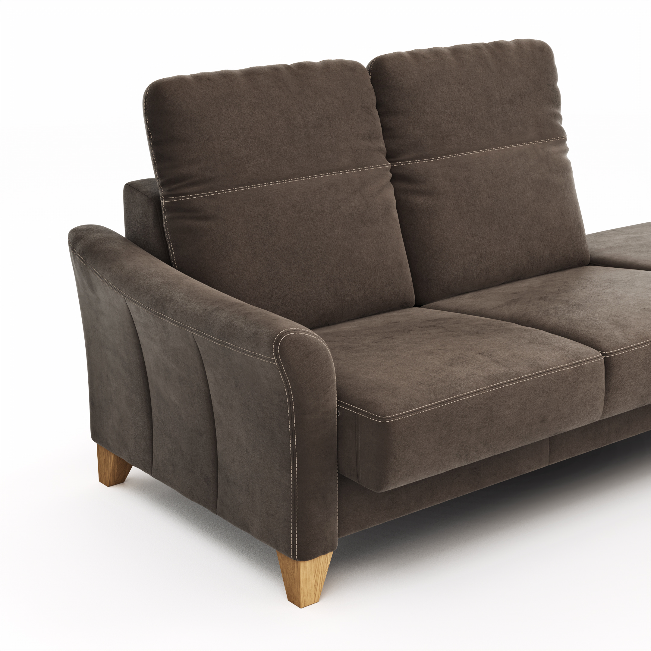 Sanfte Rundungen, weiche Linien und geschwungene Armlehnen verleihen dem Sofa einen sehr gemütlichen Aspekt. Helle Holzfüße passen ideal zum braunen Stoffbezug. Sie unterstreichen die moderne Landhaus-Optik. Eine helle Kontrastnaht betont effektvoll die Kontur des Sofas. Zusätzlich kann das Sofa mit einer Relaxfunktion ausgestattet werden. So schaffst Du Dir Deine ganz persönliche Insel zum Ausspannen für eine angenehme Langzeitbeziehung.
