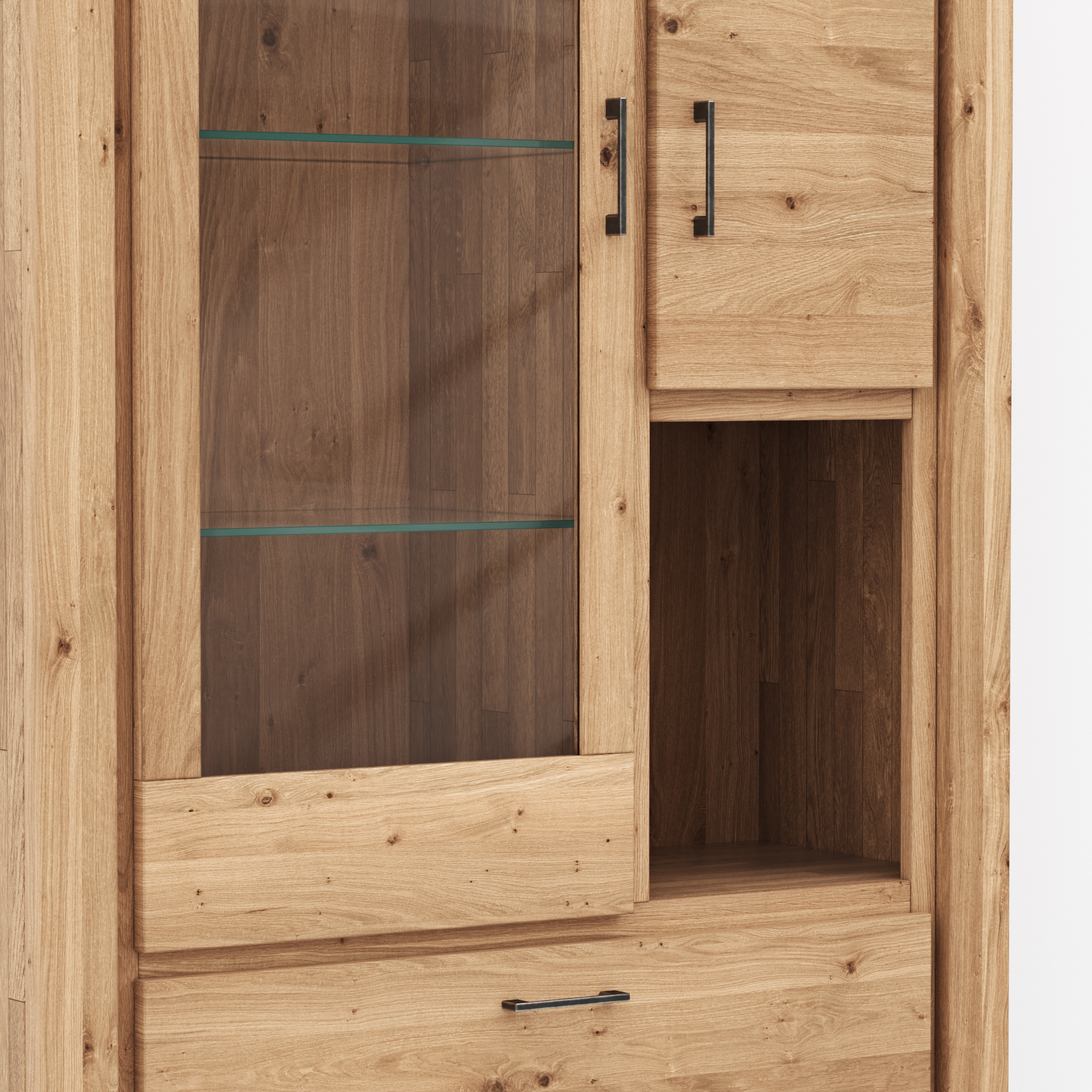 Glastür, 1 Holztür, 1 offenes Fach und 1 Schubkasten unten