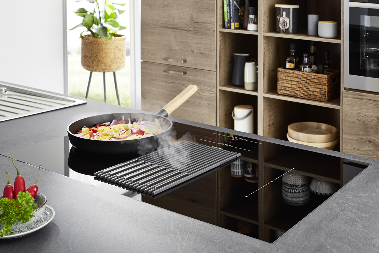 Alles drin … Hochkarätige Markentechnik von Junker und Elica: Backofen JH2306061, Kochfeld JE36DH54, Elica Dunstabzugshaube MISSYBL90-D, Kühlschrank JC40KCSE0