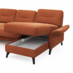 Wohnlandschaft Almyra – Ottomane links, 2,5-Sitzer inkl. Vorziehsitz (motorisch), Longchair rechts inkl. Bettkasten und Armlehne klappbar, Stoff, Kupfer