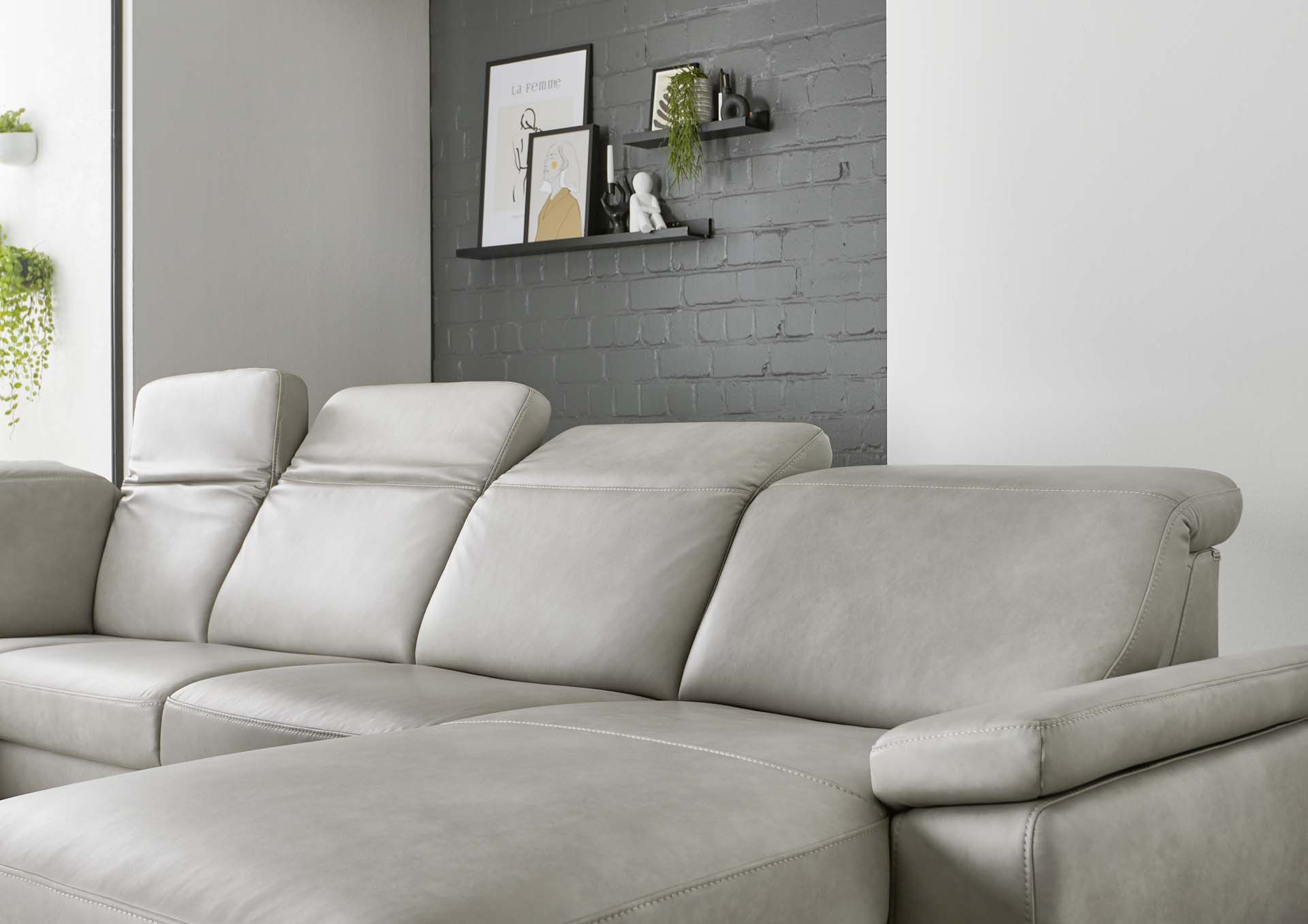 Wohnlandschaft – Ecke links mit 2,5-Sitzer und Longchair rechts, Kopfteil verstellbar, Leder, Alufarben
